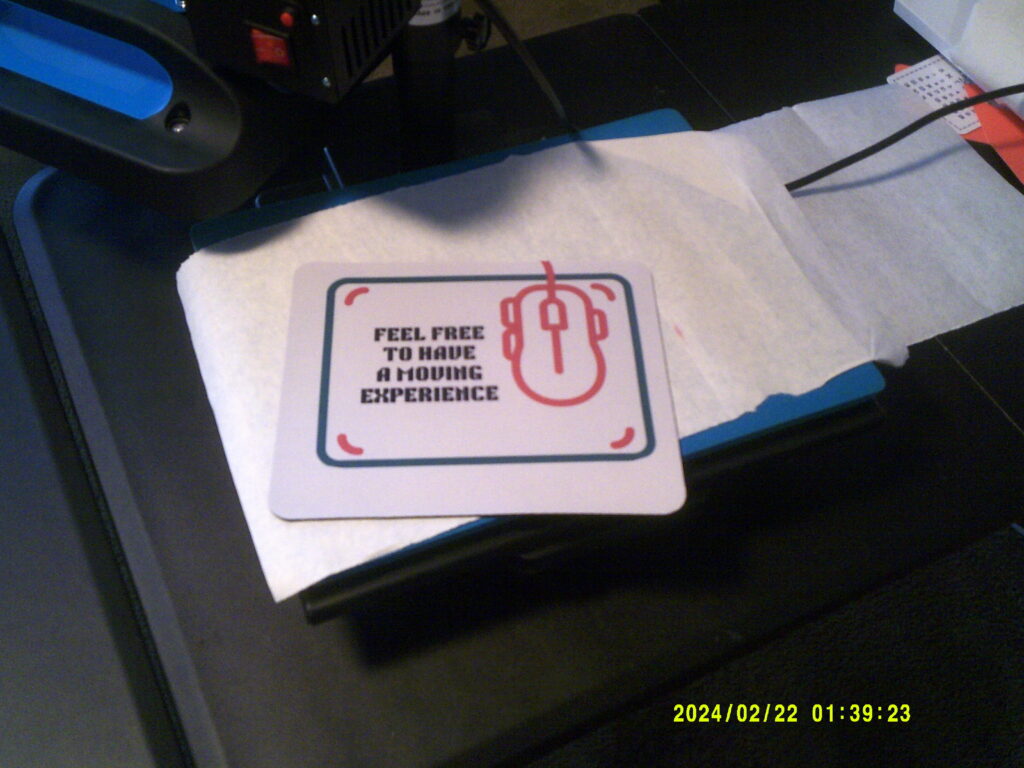 I can make a mouse pad using either vinyl or a process called sublimation. This example is sublimation, which basically means I can take a photo or drawing, print it using special sublimation ink, then using a heatpress, infuse it with the mousepad.
